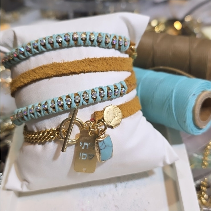 צמיד עור מלופף בשילוב אבני קריסטל שזורים בחוט שעווה