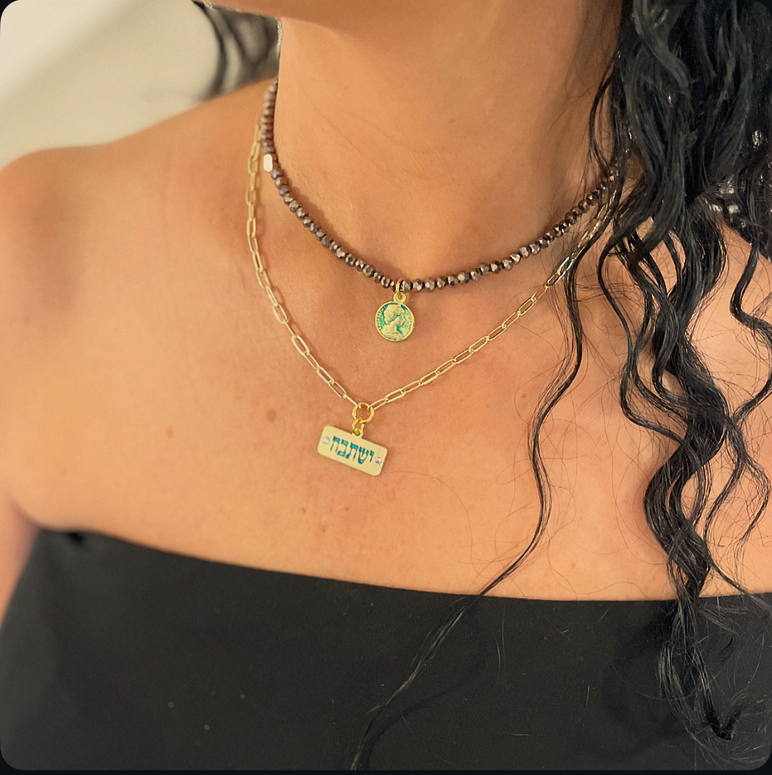 שרשרת שתי שורות חרוזי קריסטל ושרשרת חוליות בציפוי זהב שילוב של אלמנט עם אמירה לבחירה